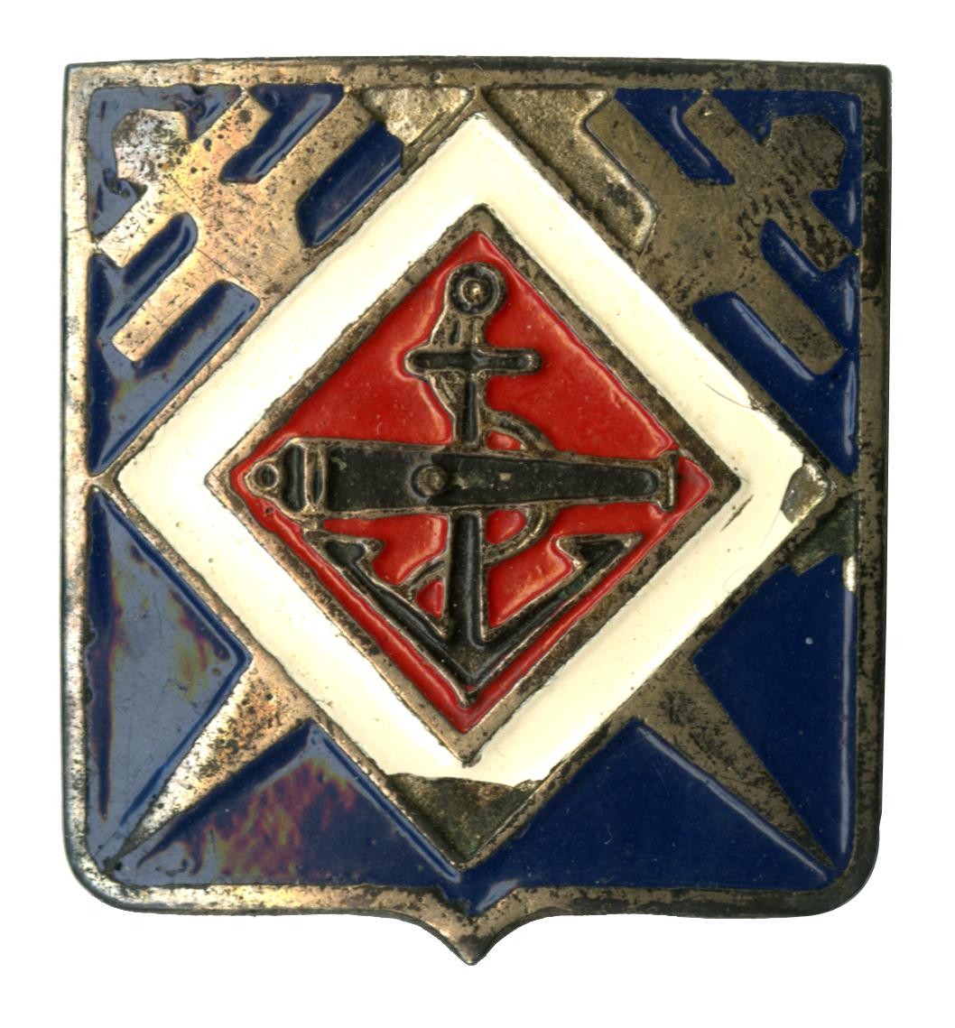L'insigne du 1er R.A. fut dessiné au Quartier Soudoie à Damas par le commandant Laurent-Champrosay lui-même ; puis peint et numéroté il fut réalisé à très peu d'exemplaires dans cette même ville à la fin de 1941. Il représentait le symbole de l'artillerie coloniale (canon et ancre de marine) sur un fond rouge et bleu couleur de l'artillerie ; le motif central était garni de deux épées croisées symbole de Jeanne d'Arc et dont la garde formait une croix de Lorraine ce qui semble avoir été une idée du commandant Laurent-Champrosay lui-même. Sur ce premier modèle l'emblème était non pas sur un fond or mais argent. Un second type émaillé cette fois fut frappé après Bir-Hakeim mais chez un fabricant du Caire en 1942. Au début de 1945 on voulu une nouvelle provision d'insignes mais la commande passée chez Drago fut mal précisée et cette dernière maison livra un insigne non plus carré mais rectangulaire où l'épée était devenue méconnaissable.Inventory number: 2011.0.138