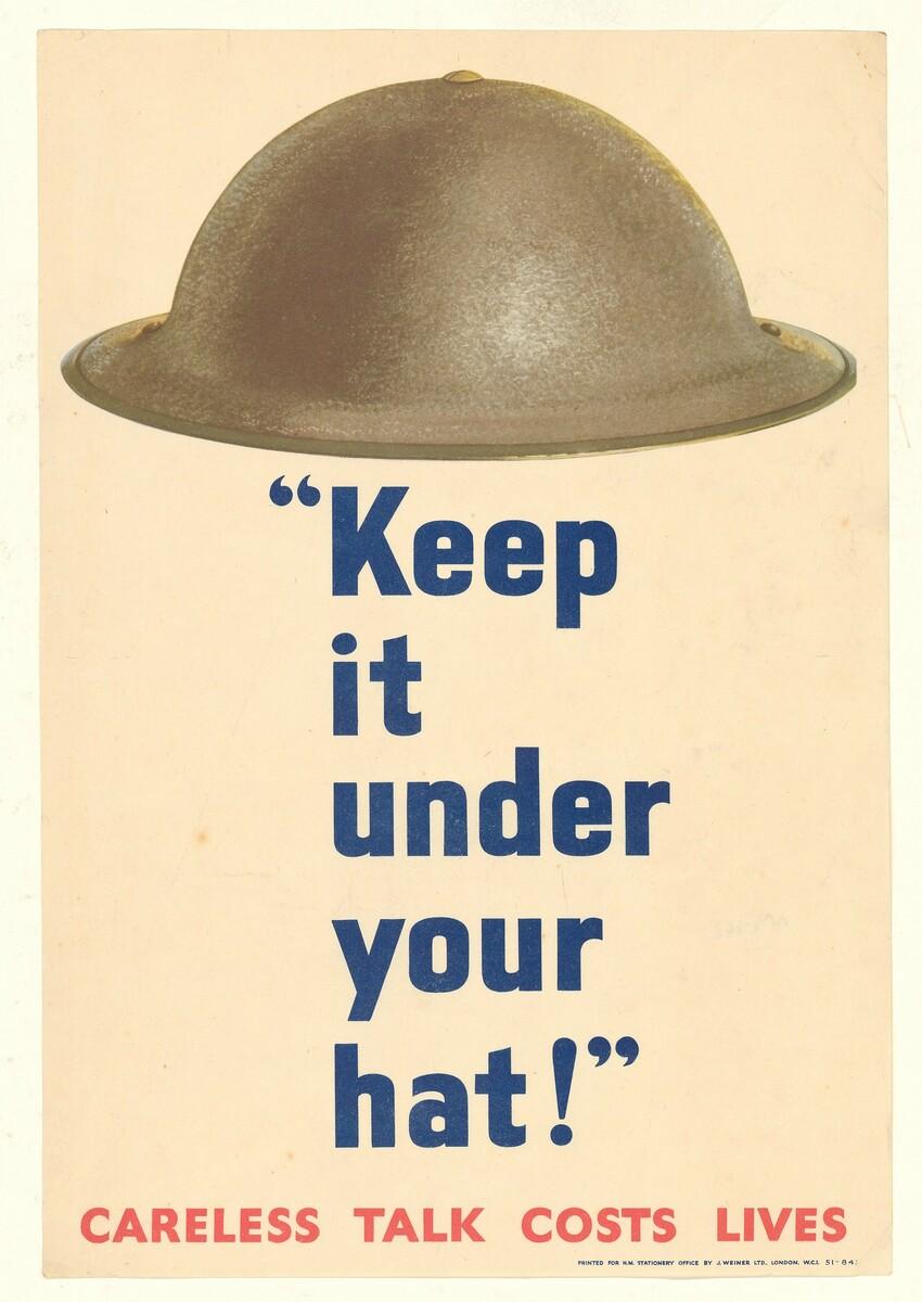 Traduction : "Gardez-le pour vous !" Une conversation imprudente peut coûter des vies.L'affiche vise à mettre en garde les Britanniques notamment les militaires contre les espions. Le slogan de l'affiche se trouver sous un casque Brodie typique de l'armée britannique pour illustrer l'expression idiomatique "under your hat" (littéralement "sous votre chapeau"). D'autres affiches du même type utilisent d'autres couvre-chefs comme le casque colonial.