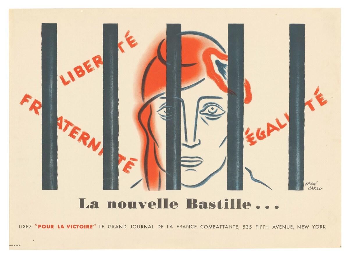 Cette affiche a été éditée aux États-Unis en faveur de "Pour la victoire" journal de la France combattante à New-York. La "nouvelle Bastille" est la France occupée derrière les barreaux de laquelle sont enfermées Marianne et la devise de la République.Inventory number: N4445