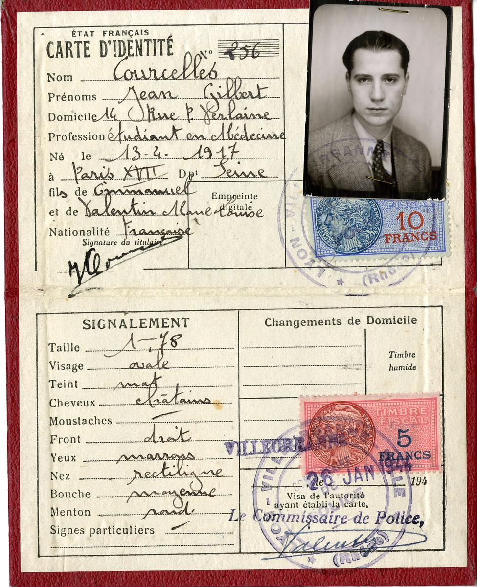 Cette fausse carte au nom de Jean Courcelles et datée du 26 janvier 1944 a servi à José Aboulker lors de la mission clandestine "Trompette" en France d'octobre 1943 à juillet 1944 .Inventory number: 2013.9.2