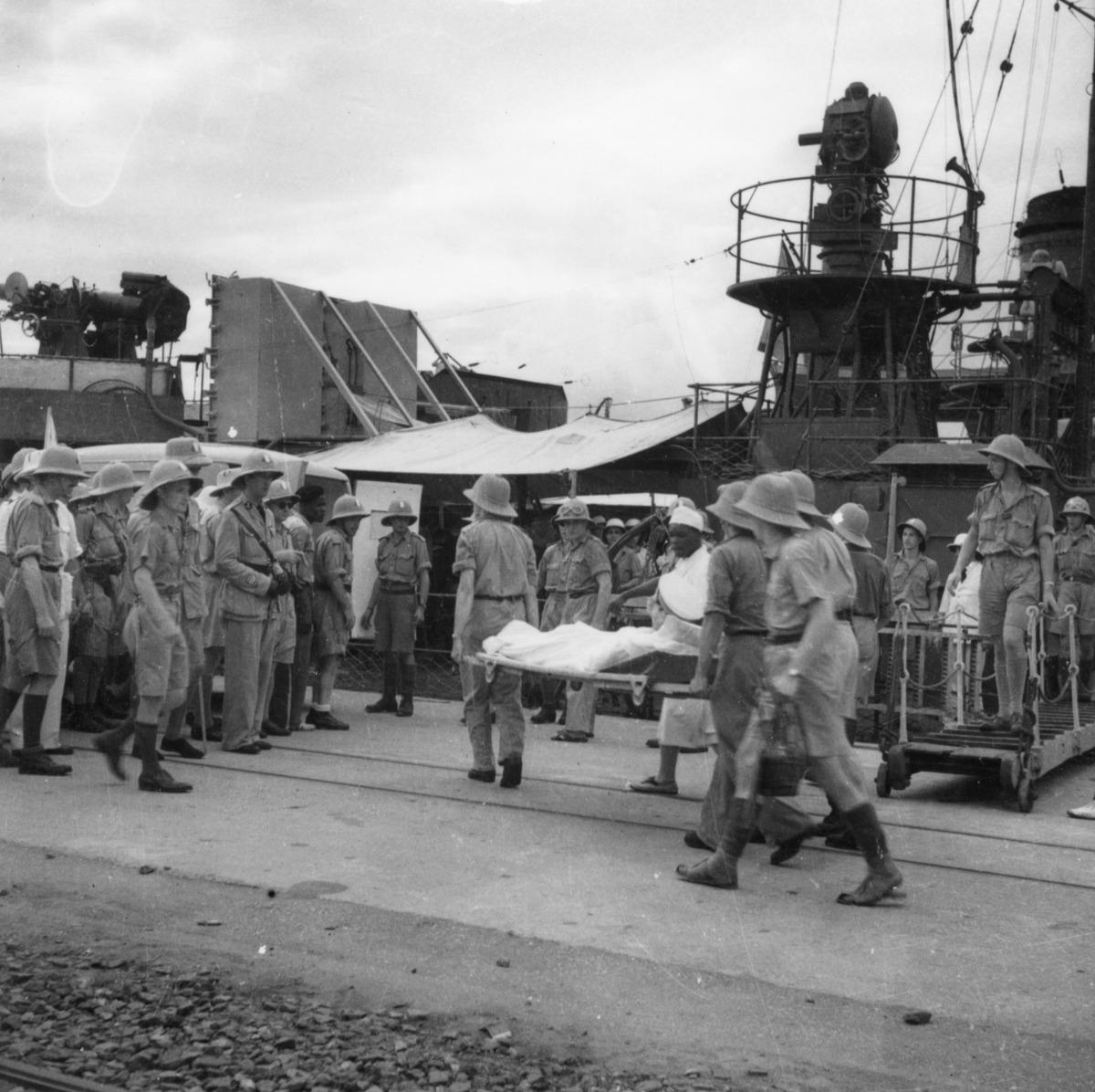 Débarquement du capitaine de frégate Thierry d'Argenlieu sur une civière