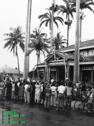 Cette manifestation de la population de Nouméa devant la mairie marque le début de l'engagement des Calédoniens qui aboutira au ralliement de l'île à la France libre. Ce cliché appartient à une série réalisée à Nouméa dès les prémices du ralliement de la Nouvelle-Calédonie à la France libre.Référence : 010127