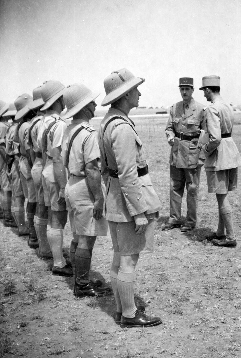 de gauche à droite : Catroux Folliot Clerc Laborde-Noguès BeheloLa première remise de croix de la Libération se déroule le 26 mai 1941 au camp de Qastina en Palestine