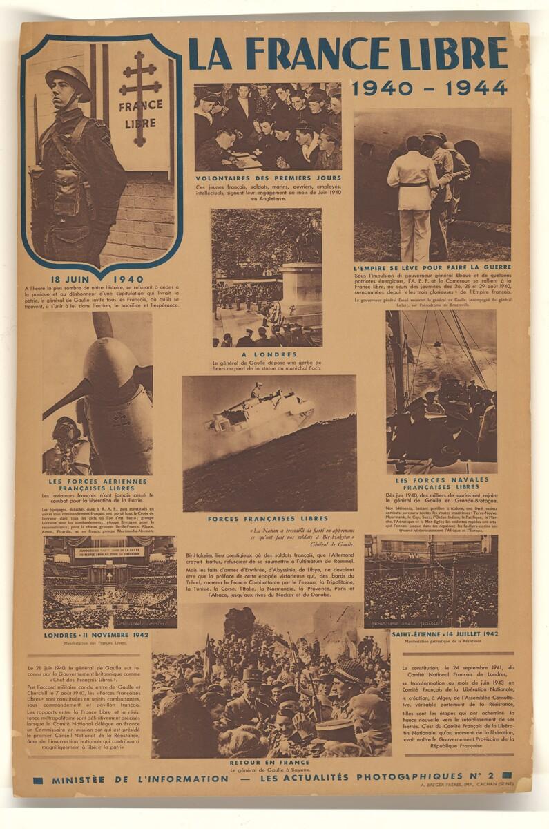 "Les actualités photographiques n°2". L'affiche retrace les grandes étapes de la France libre de l'appel du 18 juin 1940 jusqu'à la visite à Bayeux du général de Gaulle le 14 juin 1944.Numéro d'inventaire : 2008.0.6
