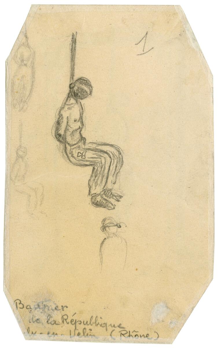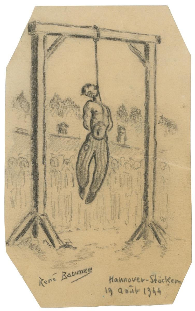 Scène de pendaison avec au second plan une esquisse des autres déportés du camp assistant par obligation. Dessin réalisé au kommando de Stöcken le 19 août 1944. Avec signature de l'artiste. Au verso des esquisses d'une seconde scène de pendaison.Dessinateur de métier René Baumer est résistant. Arrêté et interné à la prison de Montluc (Lyon) puis au camp de Compiègne il est déporté en juin 1944 à Neuengamme. Affecté au kommando de Stöcken il est enfin transféré à Bergen-Belsen où il est libéré par les Britanniques. René Baumer est décédé le 12 mai 1982 à Lyon.