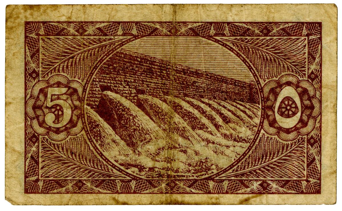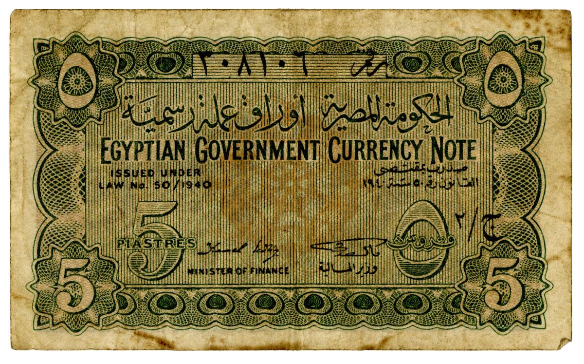 Il s'agit de la troisième émission du billet de 5 piastres égyptiennes considéré comme de la monnaie de nécessité et imprimé pendant la Seconde Guerre mondiale. La monnaie de nécessité en période de crise est un moyen de paiement émis par un organisme public ou privé pour suppléer l'argent officiel quand celui-ci vient à manquer.Numéro d'inventaire : 2019.11.9