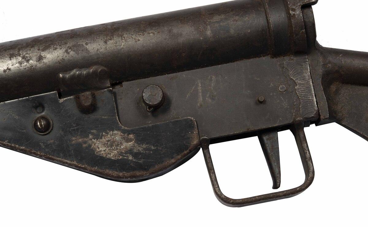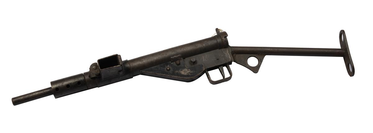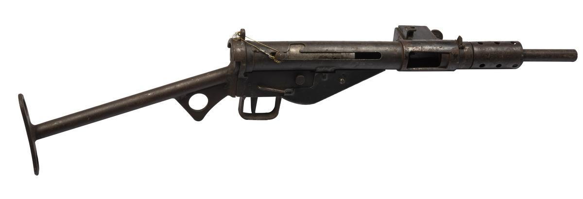 Cette arme d'aspect rudimentaire de calibre 9 mm parabellum avec un chargeur de 32 cartouches. était simple à utiliser et à produire. Elle fut fabriquée dans ses différentes versions à presque 4 millions d'exemplaires. 200 00 furent parachutées en France pour équiper la Résistance.Numéro d'inventaire : N2801