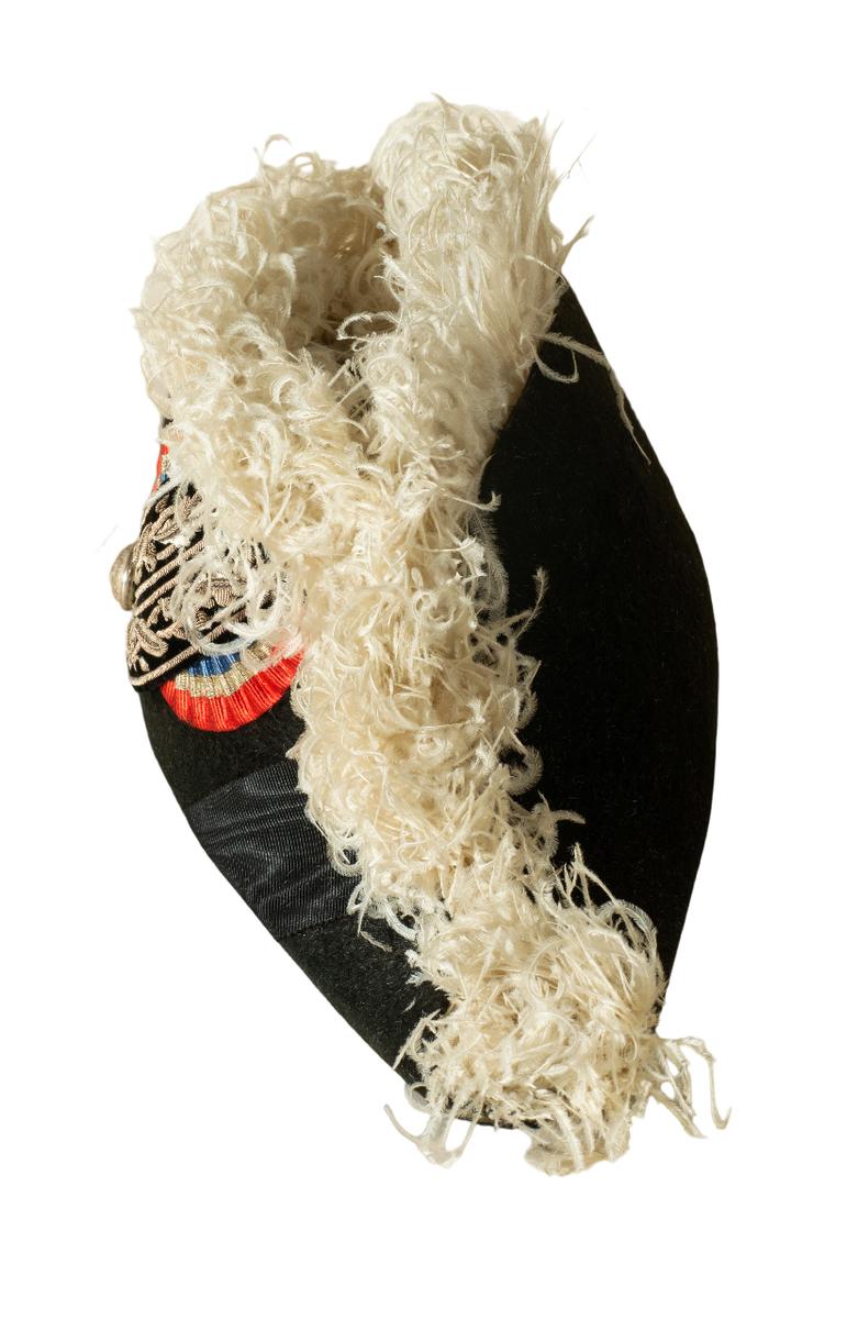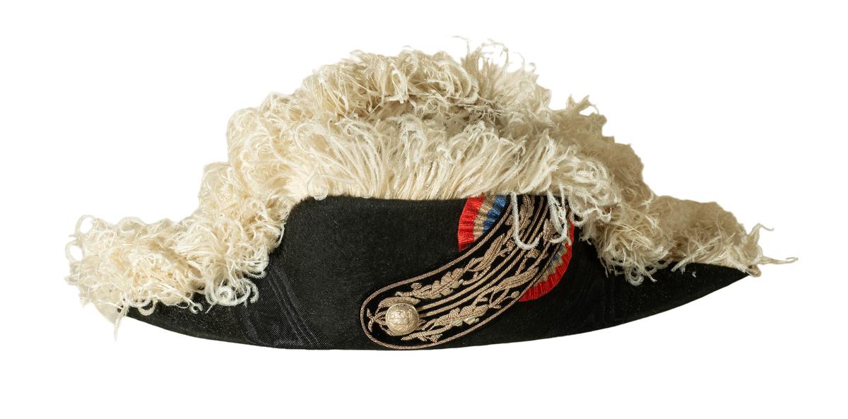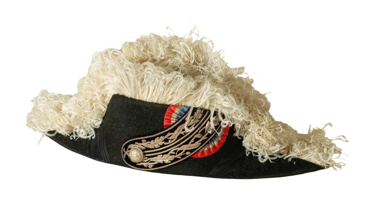 Ce bicorne de préfet de la IIIe République porte les plumes blanches réservées au préfet. En effet un décret de 1907 a attribué les plumes blanches aux seuls préfets au moment où la IIIe République a renforcé leur autorité comme premiers représentants de l'État dans les départements. Les plumes noires restant l'attribut des autorités "inférieures" comme le sous-préfet mais aussi le maire etc. Jean Moulin a été nommé préfet de l'Aveyron en mars 1937 devant ainsi le plus jeune préfet de France. En janvier 1939 il devient préfet d'Eure-et-Loir à Chartres.Numéro d'inventaire : 2022.1.1
