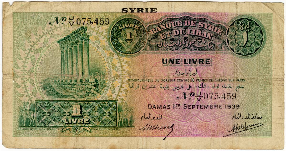 Billet d'une livre de la banque de Syrie et du Liban de Claude Raoul-Duval