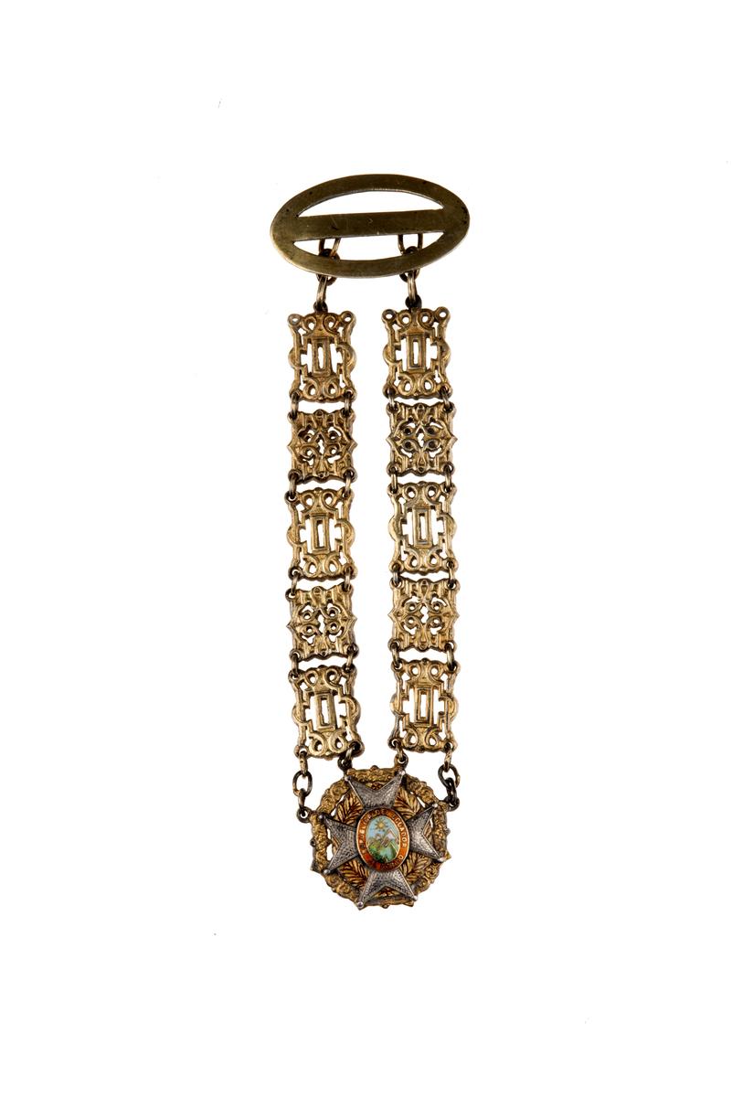Ce collier miniature pour tenue de gala accompagne le collier de l'ordre national du Mérite de l'Equateur. Cet ordre est divisé en six classes dont un collier réservé aux chefs d'État. Il récompense les mérites exceptionnels civils et militaires et peut être attribué aux étrangers l'attribution de chaque classe répondant à des critères réglementaires précis.Numéro d'inventaire : D1978.2.69
