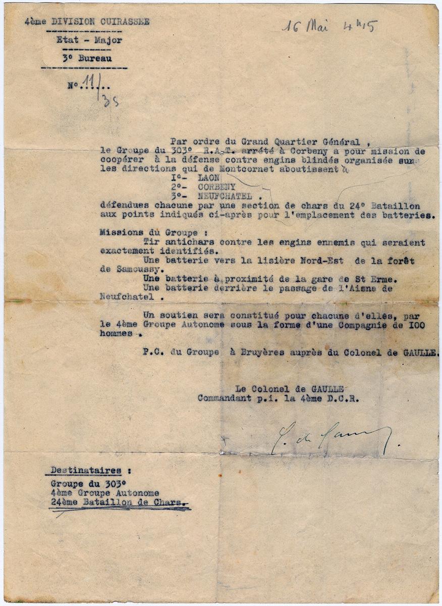 Il s'agit d'un ordre de combat émis par le colonel de Gaulle alors commandant P.I de la 4ème division cuirassée de réserve pour organiser la défense de la ville de Montcornet (Picardie).Cet ordre de combat bien qu'antérieur à la France libre est d'un intérêt évident par sa rareté (il n'avait que trois destinataires : le 303e régiment d'artillerie tractée le 4e groupe autonome et le 24e bataillon de chars et peut-être un ou plusieurs exemplaires pour les archives militaires).