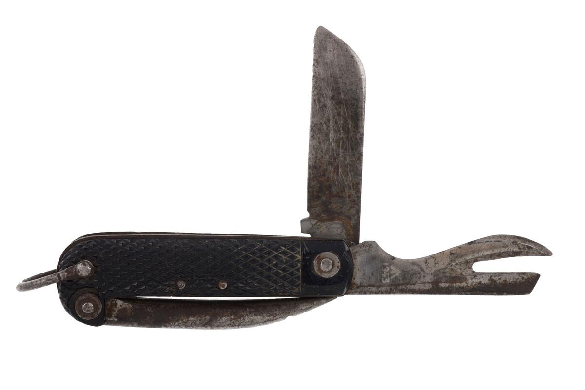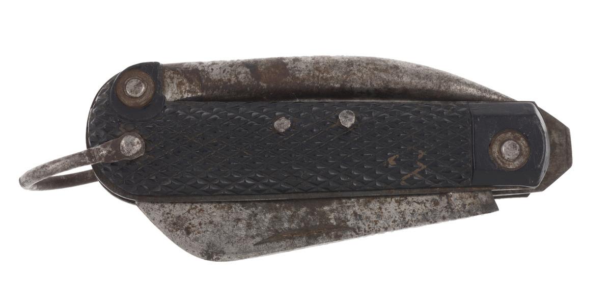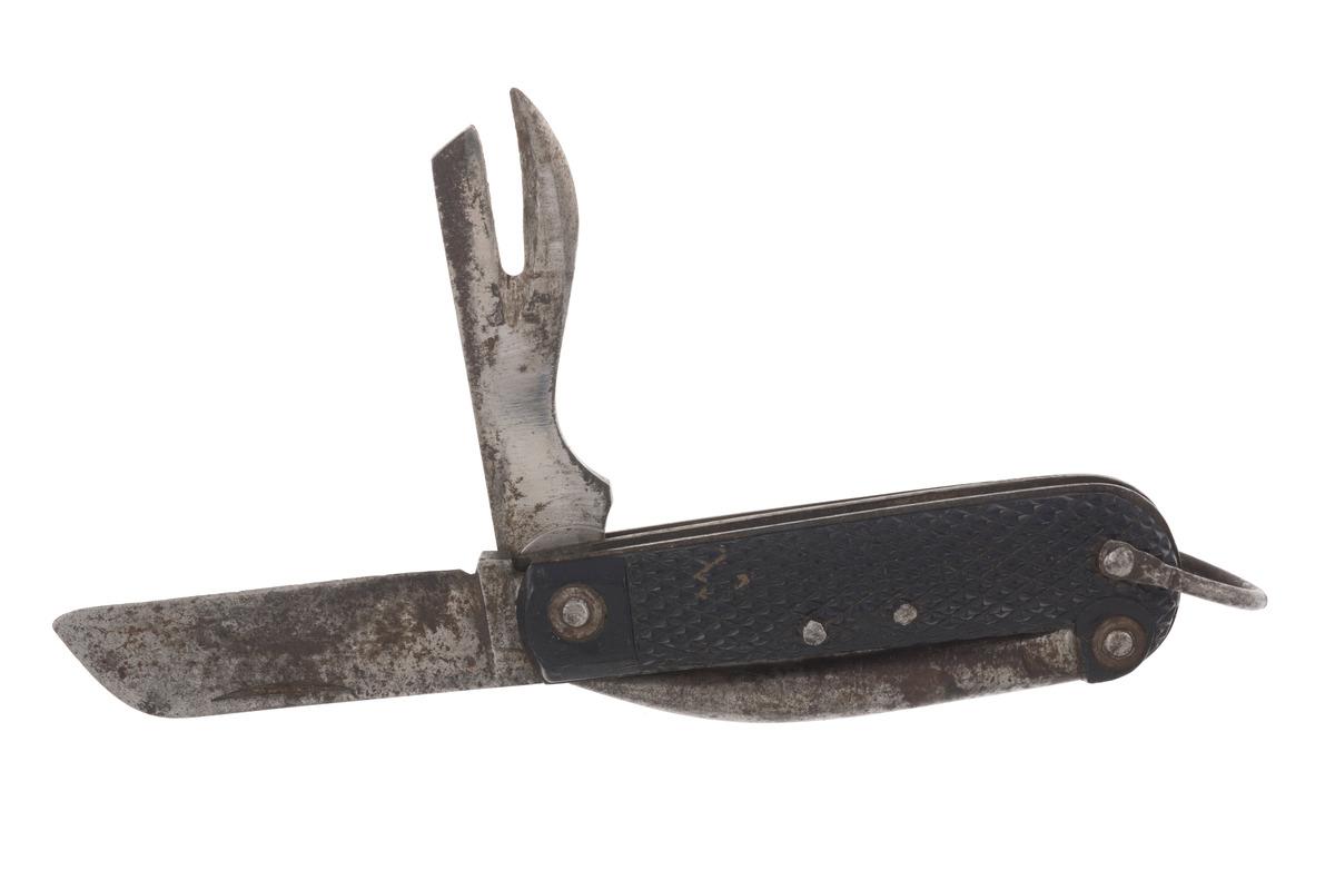 Le couteau pliant Jack knife était le couteau de dotation de l'armée britannique. Ce couteau modèle 1943 multi usage de dotation était surnommé "anti-tank" par les hommes de la 1ère division française libre en raison de la taille de son poinçon.Numéro d'inventaire : N1938