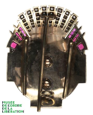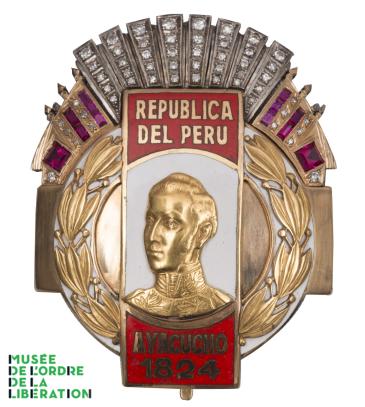Le 25 septembre 1964 Lima est la quatrième étape du périple latino-américain du général de Gaulle. Il y reçoit la grand-croix avec diamants de l'ordre militaire d'Ayacucho des mains du président Fernando Belaúnde Terry. Fondé en 1932 sous le nom de décoration militaire d'Ayacucho il devient par la suite “l'ordre militaire d'Ayacucho” du nom de la bataille d'Ayacucho de 1824. Divisé en cinq classes - le grand-croix pouvant exceptionnellement être octroyé avec diamants - il récompense les militaires péruviens et étrangers et exceptionnellement les civils. La plaque est un luxueux travail de joaillerie en or partiellement émaillé. Elle reprend le dessin de l'avers du bijou avec les légendes des deux faces sur le rouge du drapeau les rayons solaires sont sertis de diamants les drapeaux de rubis et diamants.Numéro d'inventaire : D1978.2.27.2