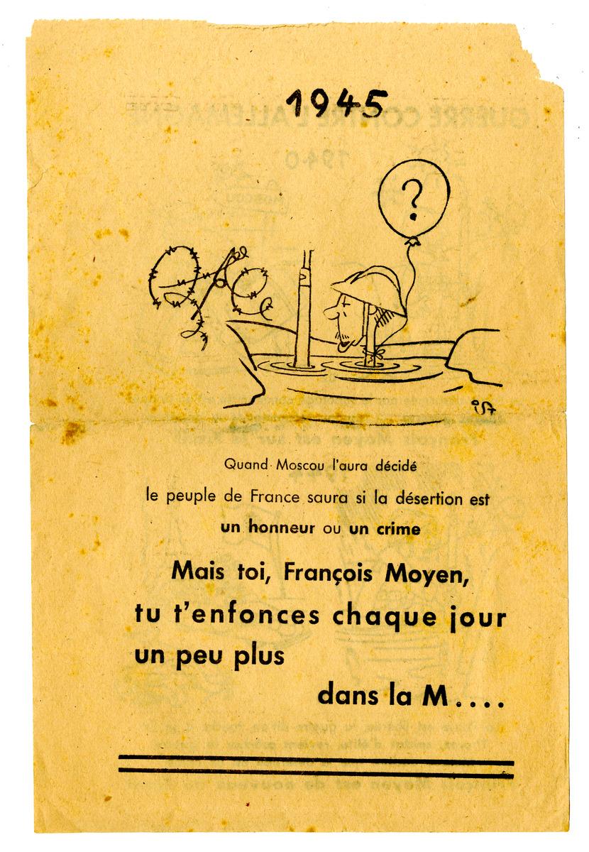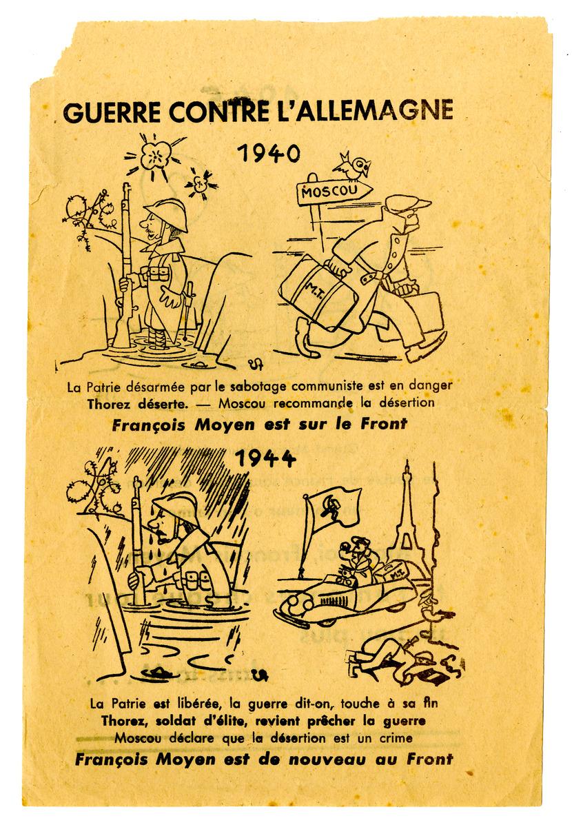 Tract de propagande allemand illustré destiné à la population française expliquant que dans la guerre contre l'Allemagne on retrouve toujours le même schéma depuis 1940 : le français moyen se bat alors que le communiste déserte et revient une fois les combats terminés. Ce dessin satirique utilise la figure de Maurice Thorez (dont les initiales sont représentées sur la valise) pour illustrer son propos.Secrétaire général du Parti communiste depuis juillet 1930 Maurice Thorez est contraint par l'Internationale communiste à déserter le 3 octobre 1939 et a passé toute la durée de la guerre en URSS. Il est condamné pour désertion le 25 novembre et en février 1940 déchu de la nationalité française. En raison de cette désertion le général de Gaulle refuse son retour en France. Amnistié en octobre 1944 par le Gouvernement provisoire il revient néanmoins en novembre et reprend ses fonctions de secrétaire général.