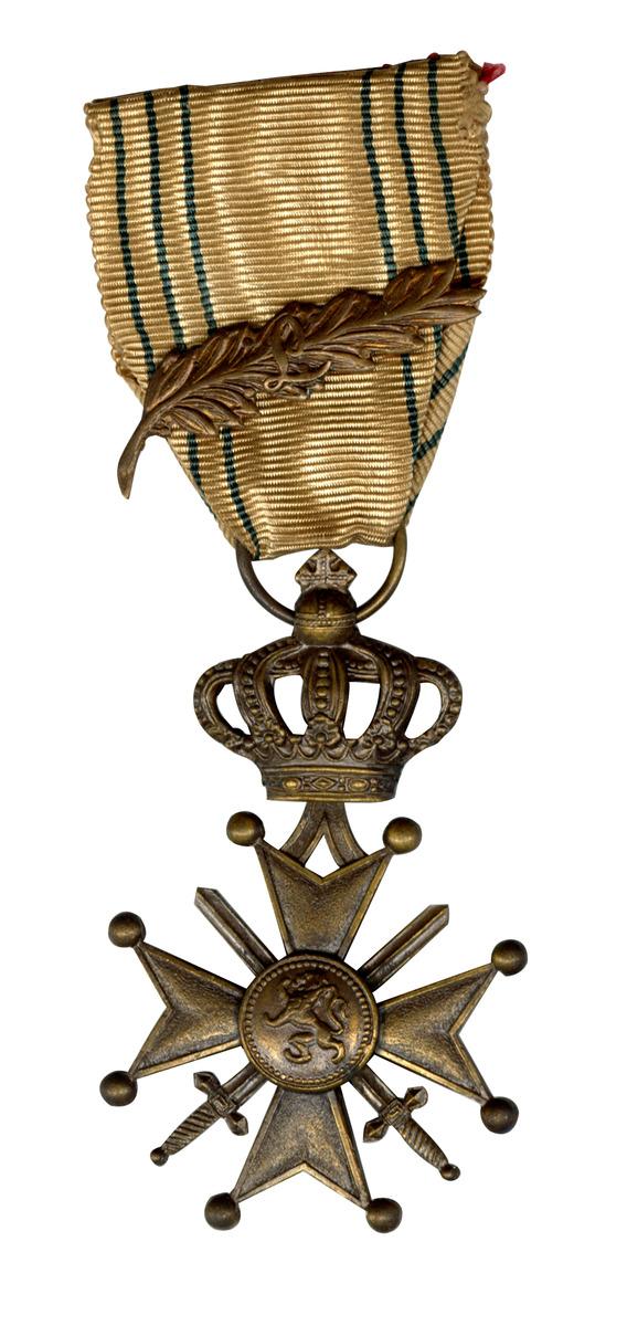 La croix de guerre 1940-1945 est de même dimension que la croix de guerre de 1914-1918. L'avers est identique et le revers ne diffère que dans le monogramme royal (celui du roi Léopold III à la place de celui du Roi Albert 1er). Le ruban 1940-1945 est rouge avec six bandes longitudinales vertes disposées en deux groupes de trois .Numéro d'inventaire : 2022.13.11