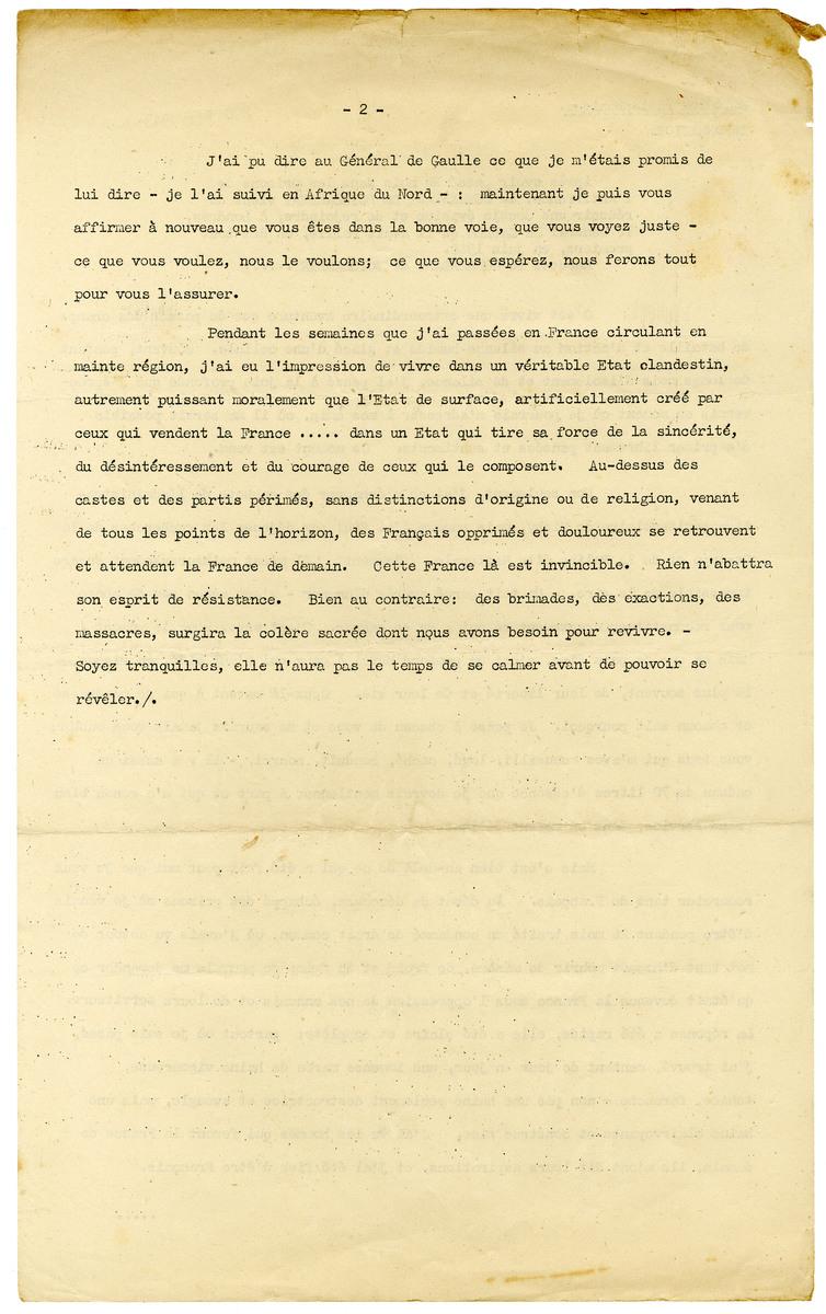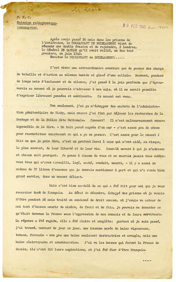 Lors de l'échec de la tentative du ralliement du Sénégal en septembre 1940 (opération de Dakar) le capitaine Hettier de Boislambert est capturé par les troupes vichystes . Il est incarcéré à la prison de Gannat en Auvergne. Il réussit à s'évader en 1942 et parvient à regagner l'Angleterre. Il relate ici son évasion en janvier 1943 à la radio de Londres. Le récit de cette évasion et les divers témoignages de ses camarades à la BBC permettent de faire connaitre aux Français les exploits et les combats de la France libre.Numéro d'inventaire : N155