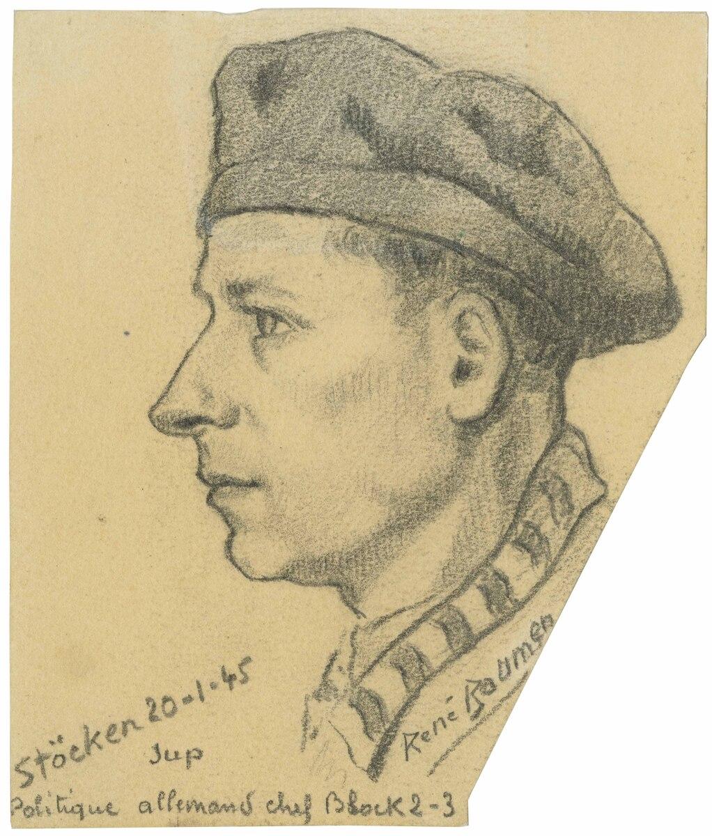 Dessin réalisé au Kommando de Stöcken le 20 janvier 1945. Avec signature de l'artiste.Dessinateur de métier René Baumer (1906-1982) est résistant. Arrêté et interné à Montluc (Lyon) puis au cap de Compiègne il est déporté en juin 1944 à Neuengamme. Affecté au Kommando de Stöcken il est enfin transféré à Bergen-Belsen d'où il est libéré par les Britanniques.