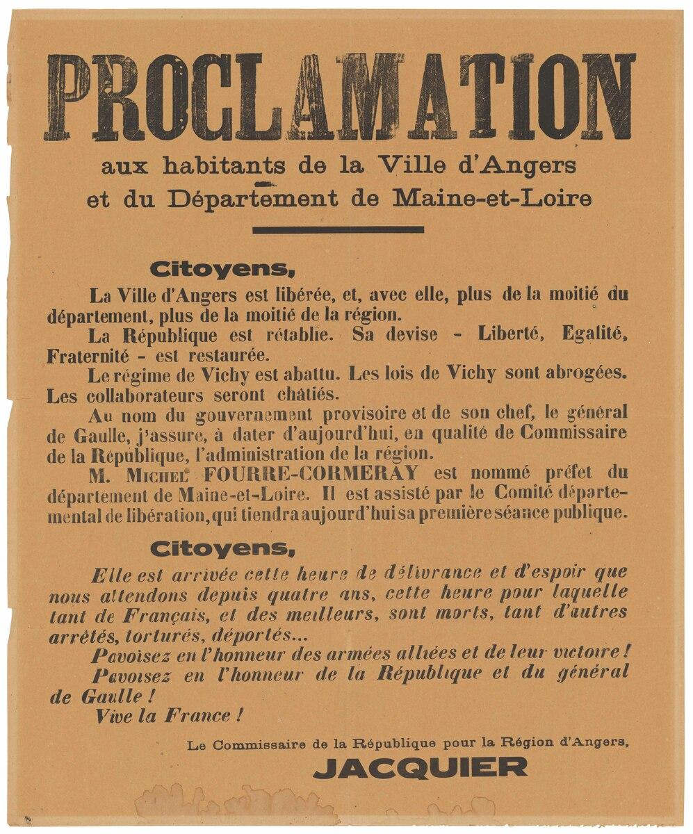 L'imprimeur de cette affiche n'est pas connu. Il s'agit d'une proclamation aux habitants de la ville d'Angers et du département de Maine-et-Loire signée Jacquier (Michel Debré) commissaire de la République au moment de la Libération.Numéro d'inventaire : 2012.0.45