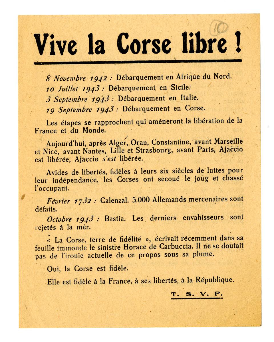 Tract du Comité Exécutif du Parti Socialiste émis après octobre 1943 et faisant un parallèle entre les luttes passées des Corses pour leur indépendance et la lutte contre les occupants italiens et allemands. Le 9 septembre 1943 au lendemain de l'officialisation de l'armistice italien ordre est donné par la Résistance corse d'entrer en insurrection alors qu'aucun débarquement n'a encore eu lieu et qu'une imposante division blindée allemande est arrivée en renfort. Les combats de la libération sont alors emmenés par les résistants corses rejoints une dizaine de jours plus tard par les troupes françaises d'Alger. Le déclenchement de l'opération "Vésuve" déversant sur une dizaine de jours quelque 6 500 hommes sur les côtes corses mènera de fait à la libération du premier territoire national le 4 octobre 1943.Numéro d'inventaire : 2020.0.64