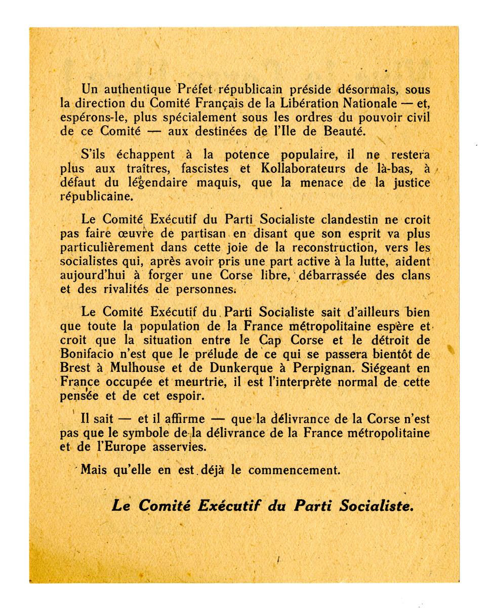 Tract du Comité exécutif du Parti socialiste "Vive la Corse libre !"