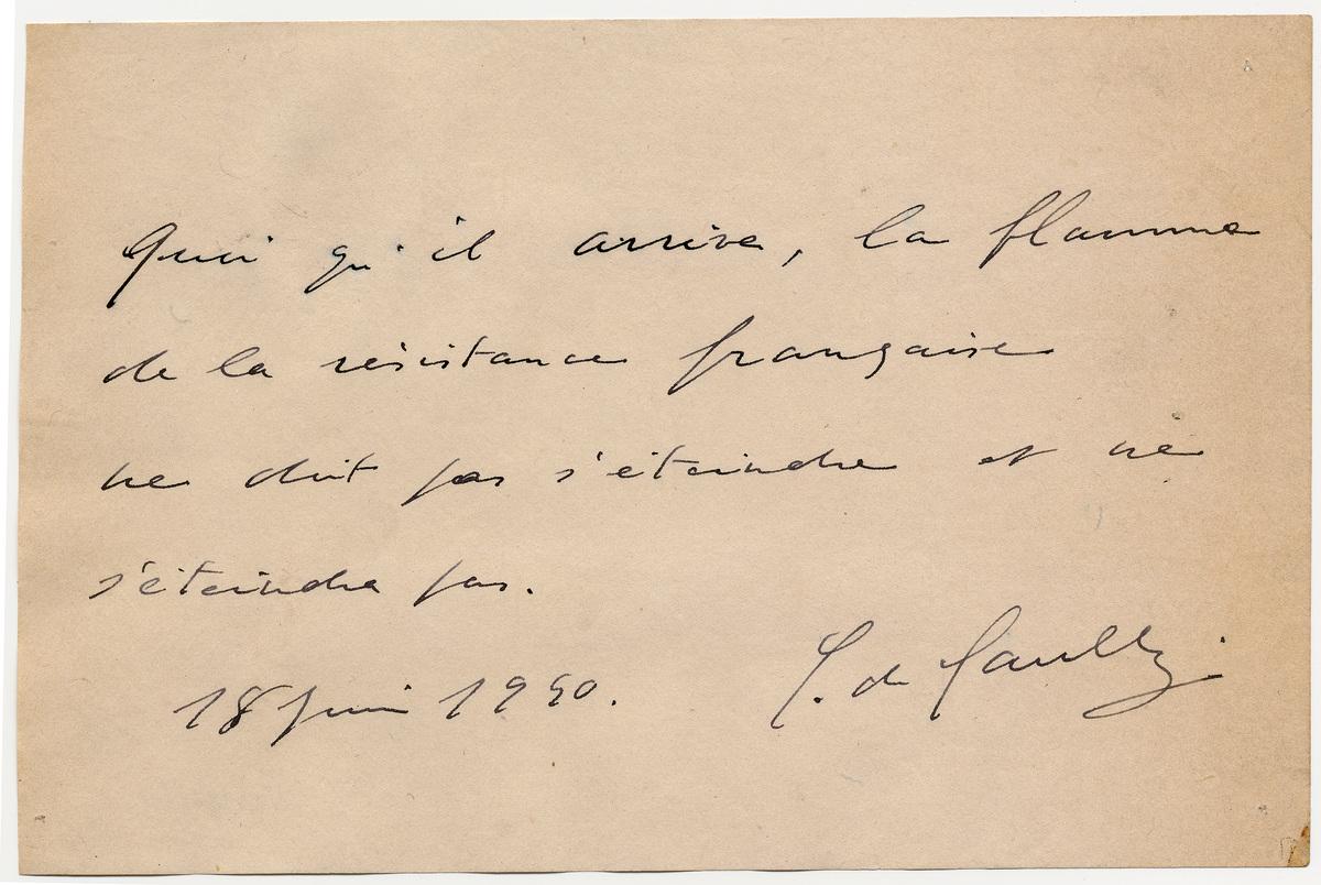 Le manuscrit reprend la dernière phrase de l'Appel du 18 juin lancé à la radio de Londres : "La flamme de la Résistance ne doit pas s'éteindre et ne s'éteindra pas". Ce document est daté du 18 juin 1940 mais il a été réécrit spécialement par le général de Gaulle pour figurer la brochure "Au service de la France 1940-1944" rédigée à Londres en 1944 par Janine Raynaud.Numéro d'inventaire : N46