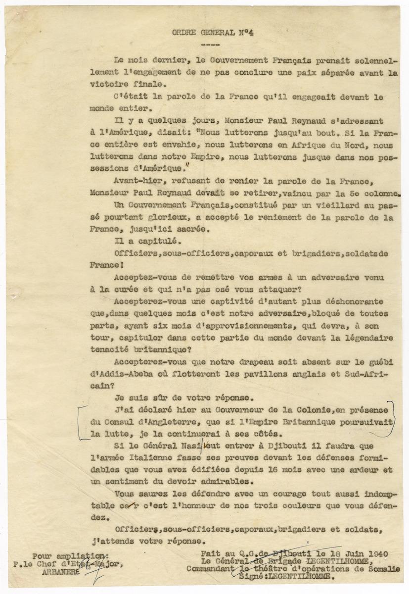 A la veille de la guerre en janvier 1939 le général Legentilhomme est commandant supérieur des troupes françaises en Côte des Somalis. Dès le 18 juin 1940 à Djibouti dans son "Ordre Général n° 4" il dénonce l'armistice et annonce son intention de continuer la guerre aux côtés de l'Empire britannique. Il tente avec l'aide du colonel de Larminat de rallier la colonie à la France libre mais en vain. Il est remplacé le 22 juillet 1940 et quitte les Somalis le 2 août pour rallier le général de Gaulle et rejoindre l'Angleterre où il débarque le 31 octobre 1940.Numéro d'inventaire : N499