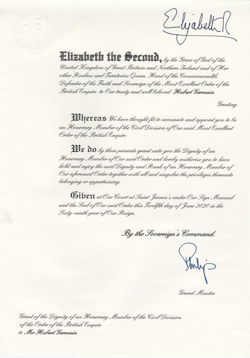 Diplôme de membre de l'ordre de l'Empire britannique (division civile) de Hubert Germain