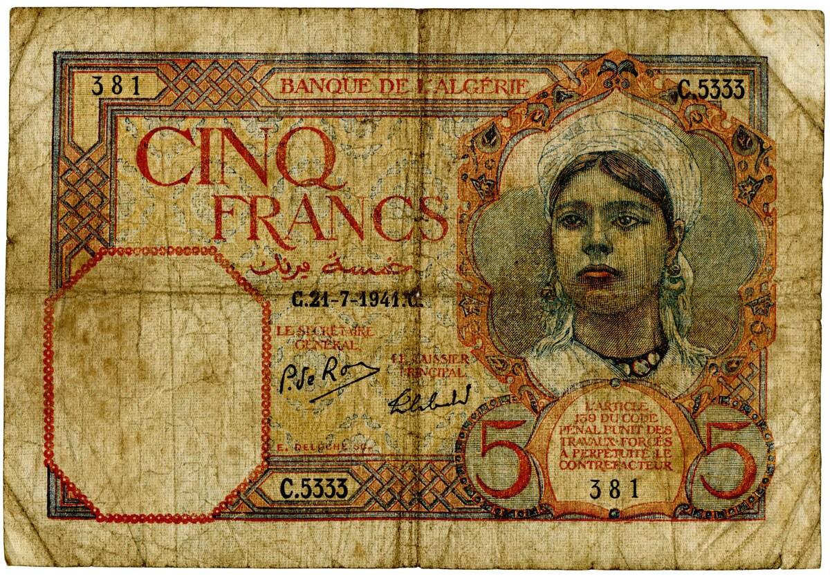 Billet de 5 Francs de la banque d'Algérie de Michel Abalan