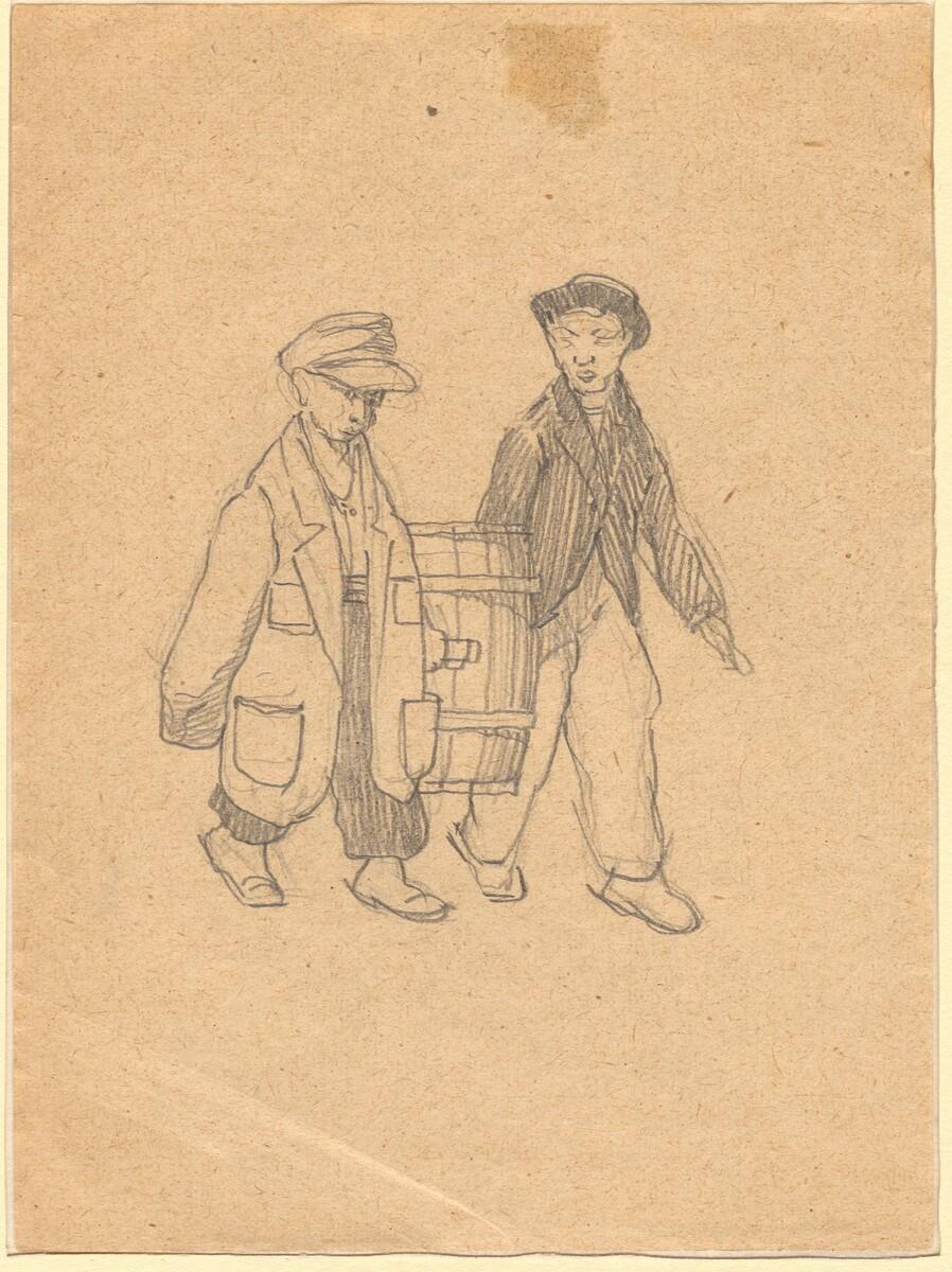 Au revers se trouve une inscription manuscrite décrivant la scène " Corvée de marmite (.. .) Des vêtements des gosses n'est pas caricaturée elle est exacte oct 44".Architecte et maire de Sens (Yonne) Lazare Bertrand (1885-1959) est interné à Compiègne puis déporté le 15 juillet 1944 vers le camp de Neuengamme en tant que "personnalité-otage". À ce titre il bénéficie de conditions privilégiées (pas d'appel ni de travail forcé logement séparé des autres détenus) qui lui permettent de dessiner sans risques particuliers. S'il ne la vit pas comme les autres déportés il peut néanmoins observer la dure réalité des conditions concentrationnaires. À Neuengamme puis à Theresienstadt il réalise une centaine de dessins et croquis jusqu'à son retour en France en mai 1945.