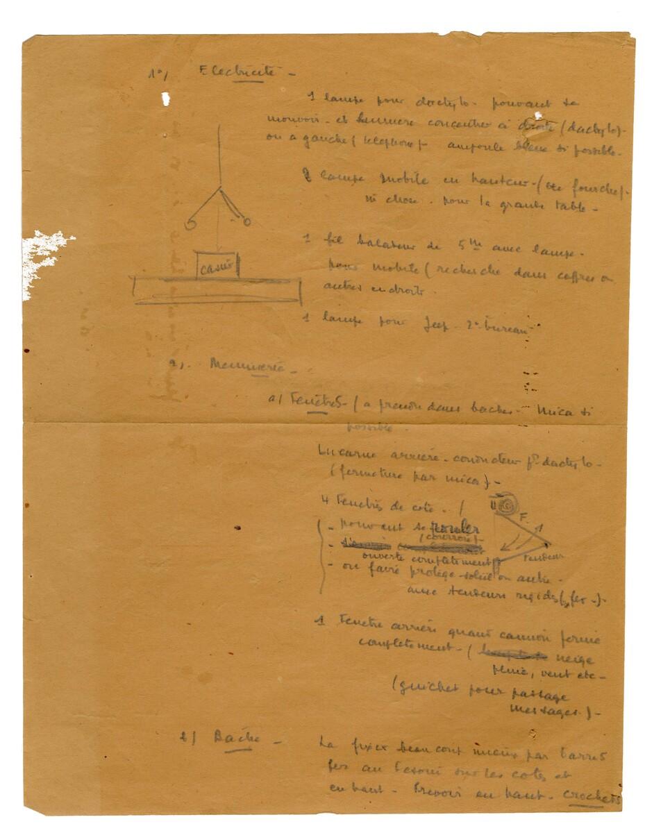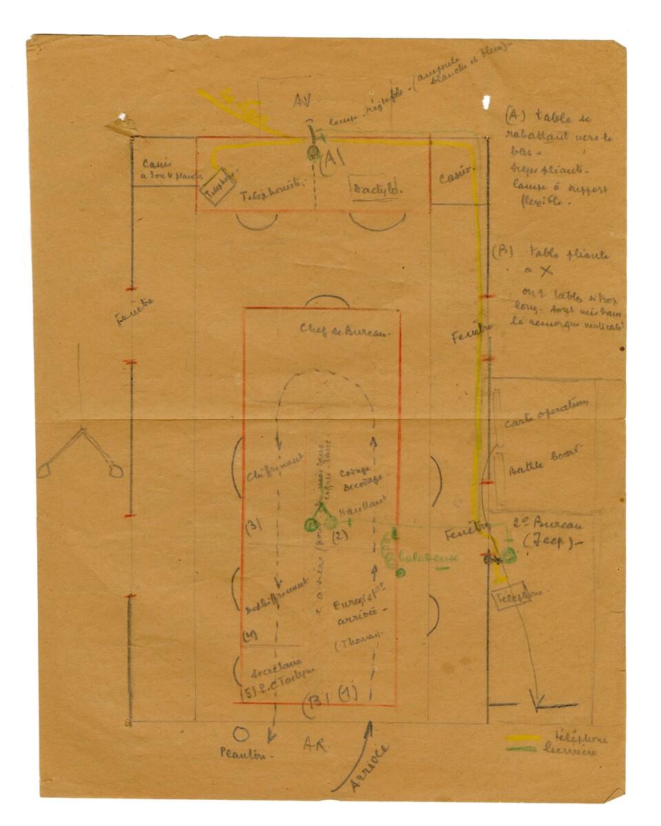 Ce plan dessiné en 1941 à Alep en Syrie par Jules Muracciole est destiné à l'aménagement intérieur de camions pour en faire des bureaux pour l'état-major et la compagnie hors rang de la 1ère brigade française libre.Numéro d'inventaire : N522.1