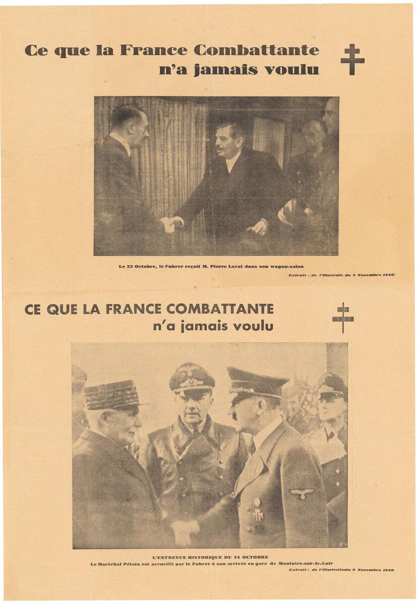 Affiche de la France combattante dénonçant l'entrevue de Montoire et la collaboration composée de deux photographies extraites de l"lllustration" du 9 novembre 1940.Numéro d'inventaire : N4589