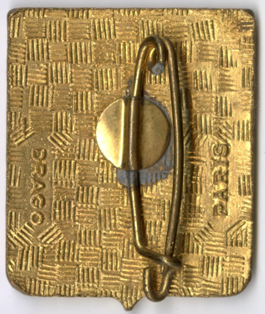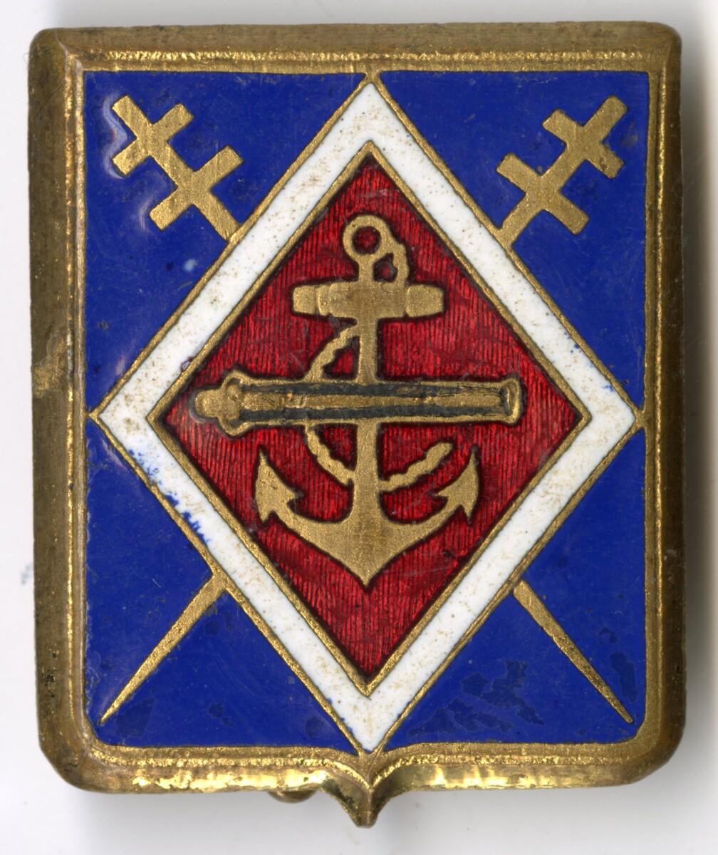 L'insigne du 1er RA fut dessiné au Quartier Soudoie à Damas par le commandant Laurent-Champrosay lui-même ; puis peint et numéroté il fut réalisé à très peu d'exemplaires dans cette même ville à la fin de 1941. Il représentait le symbole de l'artillerie coloniale (canon et ancre de marine) sur un fond rouge et bleu couleur de l'artillerie ; le motif central était garni de deux épées croisées symbole de Jeanne d'Arc et dont la garde formait une croix de Lorraine ce qui semble avoir été une idée du commandant Laurent-Champrosay lui-même. Sur ce premier modèle l'emblème était non pas sur un fond or mais argent. Un second type émaillé cette fois fut frappé après Bir-Hakeim mais chez un fabricant du Caire en 1942. Au début de 1945 on voulu une nouvelle provision d'insignes mais la commande passée chez Drago fut mal précisée et cette dernière maison livra un insigne non plus carré mais rectangulaire où l'épée était devenue méconnaissable.In "Les Français libres et leurs emblèmes" Bernard Le Marec.