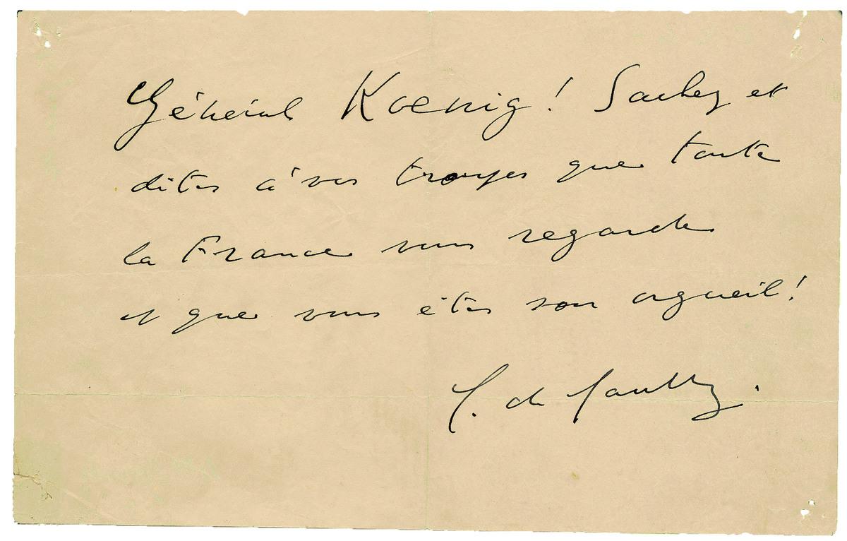 Ce manuscrit est un don de Janine Raynaud membre durant la guerre du commissariat national à l'Intérieur et en charge de questions de propagande. En 1944 elle conçut la brochure illustrée « Au service de la France 1940-1944 » qui retrace en 64 pages l'histoire militaire et politique de la France libre. Pour l'occasion Janine Raynaud a obtenu du général de Gaulle qu'il réécrive le texte du télégramme qu'il avait adressé au général Koenig le 10 juin 1942 à l'issue de la bataille de Bir Hakeim pour faire figurer le manuscrit dans la brochure (page 32). Le Général accepta également pour le même projet de réécrire l'avant-dernière phrase de son appel du 18 juin « Quoi qu'il arrive la flamme de la Résistance ne doit pas s'éteindre et ne s'éteindra pas ». Janine Raynaud conserva ensuite ces deux manuscrits avant d'en faire don au musée de l'ordre de la Libération.Numéro d'inventaire : N568
