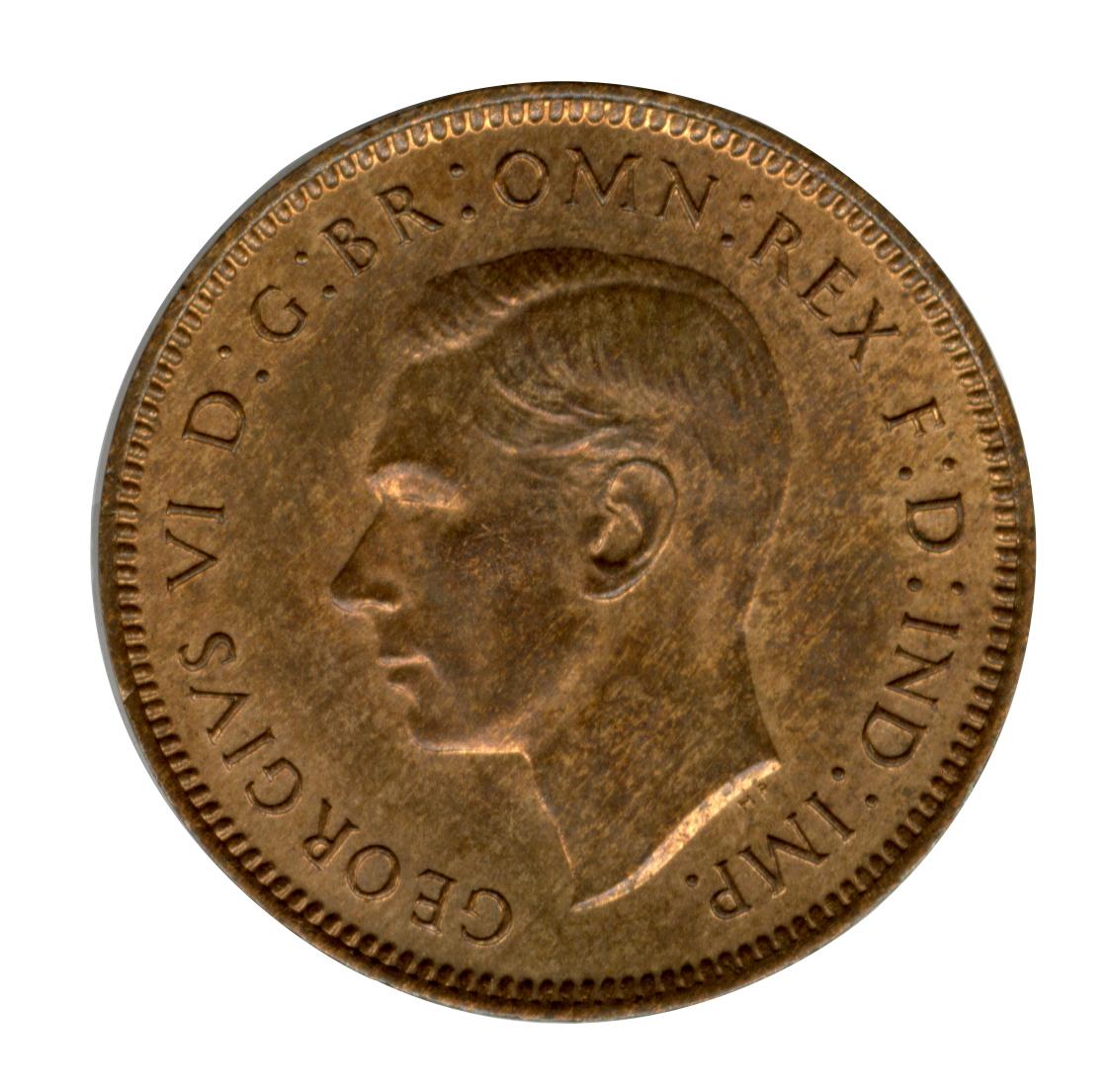 Avers : GEORGIVS VI D:G:BR:OMN:REX F:D:IND:IMP. HP signifiant Le roi George VI l'inscription "Dei Gratia Britanniarum Omnium Rex" (Roi de toutes les Bretagnes par la grâce de Dieu) et les titres de "Fidei Defensor" "India Imperator" (Défenseur de la foi Empereur des Indes).Revers : FARTHING représentant le Troglodyte mignon (Troglodytes troglodytes) qui est un des plus petits oiseaux d'Europe après le roitelet.