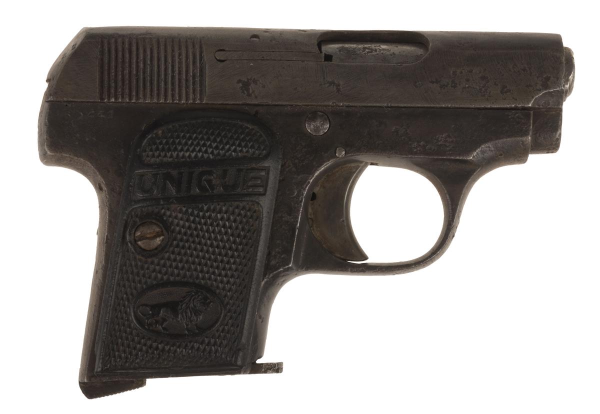 Fabriqué durant l'entre-deux guerre le pistolet Unique est un pistolet de défense dérivé du Browning modèle 1906.Numéro d'inventaire : 2009.12.3.1