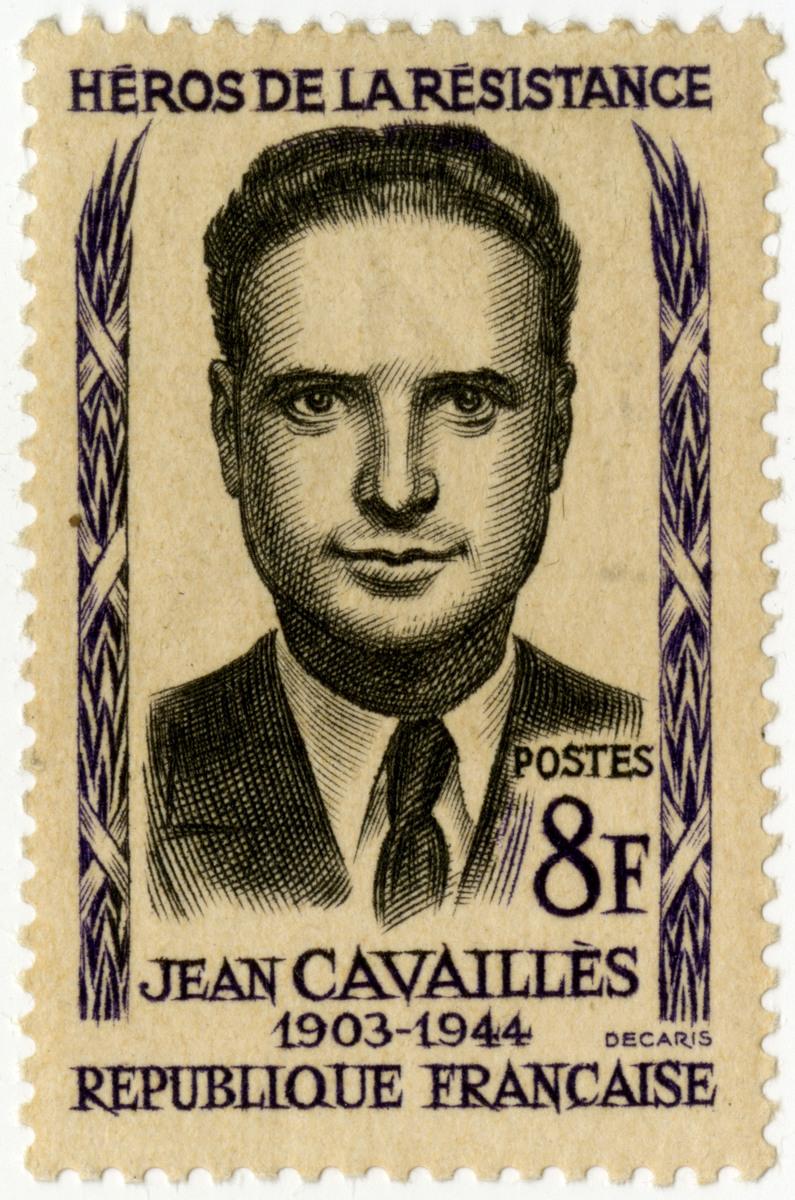 À partir de 1957 les Postes françaises décident d'émettre des séries de timbres à la mémoire des Héros de la Résistance. Entre 1957 et 1961 cinq séries furent ainsi émises. Les femmes et les hommes retenus représentent le monde de la clandestinité dont ils avaient été partie prenante pendant le conflit. Ils représentent également la diversité de la Résistance de la France combattante des mouvements et réseaux de la Résistance intérieure. Il y eut en tout 23 timbres émis.Ce timbre représente Jean Cavaillès et fait partie de la seconde série émise en avril 1958. Cette série distinguait spécifiquement quatre compagnons de la Libération. Il est représenté en buste de face encadré par des gerbes de blés symbole de justice. Mobilisé en 1940 comme lieutenant d'infanterie coloniale il est fait prisonnier. Il s'évade et participe à la création du mouvement Libération-Sud avant d'intégrer la direction de Libération-Nord. Arrêté le 28 août 1943 il est emprisonné à Fresnes et torturé. Il est fusillé à Arras en 1944. Son corps n'est retrouvé qu'à la fin de la guerre au cimetière de la ville.