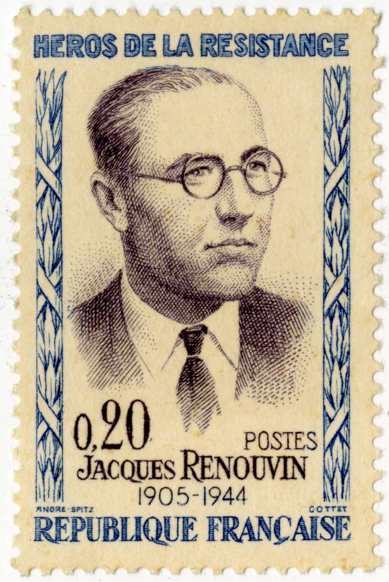 À partir de 1957 les Postes françaises décident d'émettre des séries de timbres à la mémoire des Héros de la Résistance. Entre 1957 et 1961 cinq séries furent ainsi émises. Les femmes et les hommes retenus représentent le monde de la clandestinité dont ils avaient été partie prenante pendant le conflit. Ils représentent également la diversité de la Résistance de la France combattante des mouvements et réseaux de la Résistance intérieure. Il y eut en tout 23 timbres émis.Ce timbre représente Jacques Renouvin et fait partie de la cinquième série émise en 1961. Compagnon de la Libération il fonde les corps francs à Montpellier à la fin de 1940. Il refusa de rejoindre Londres via l'Afrique du nord. Il organise les premiers sabotages industriels et se déplace d'une région à une autre pour entrainer au combat les volontaires de la Résistance. Trahi par un espion il est arrêté le 29 janvier 1943 et déporté à Mauthausen. Il y meurt d'épuisement le 24 janvier 1944.