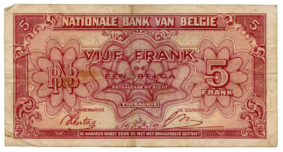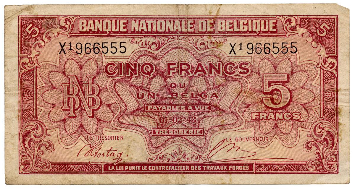 Ce billet belge imprimé au Royaume-Uni en 1943 a appartenu à René Molinier né en 1918 à Saint-Martin-La-Méanne en Corrèze et engagé volontaire dans l'armée de l'air en 1938. Breveté pilote à l'Ecole de l'Air en 1939 il reste dans l'armée de l'air tout en entrant dans la Résistance au service du COPA en novembre 1942 en Corrèze. Devenu chef régional COPA de R5 (Limoges) il dirige sous le nom de code de Jac 1 et le pseudonyme de Thierry les premières opérations de parachutage comme adjoint d'Alain Grout de Beaufort aliac Jac. Recherché par les Allemands il est évacué par opération aérienne en octobre 1943 vers l'Angleterre depuis le Jura. Il sert ensuite dans la RAF sous le nom de J. G. Gilbert puis aux groupes de chasse Berry et Alsace. René Molinier est médaillé de la Résistance française.Numéro d'inventaire : 2024.15.7