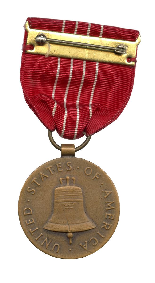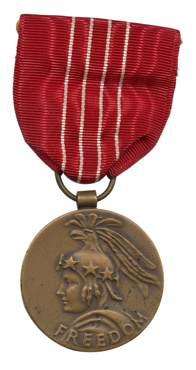 Créée en 1945 la Medal of Freedom est une prestigieuse décoration militaire décernée par le président des États-Unis pour récompenser les services rendus par des civils à la nation. En particulier à celles et ceux qui sont venus au secours des militaires américains dans les zones de combat ou occupées par l'ennemi. La médaille représentant à l'avers une tête de profil portant un casque étoilé surmonté d'une tête d'aigle au-dessus de l'inscription « Freedom » et au revers une cloche avec l'inscription « United States of America ». Cette cloche est la fameuse Liberty Bell maintenant conservée à Philadelphie (monument historique) ; elle est fêlée pour avoir trop retenti lors de la déclaration d'indépendance des États-Unis d'Amérique. Marthe Lebon entre dans la Résistance à 19 ans au sein d'un réseau d'évasion de pilotes alliés. Elle rejoint ensuite le bureau des opérations aériennes (BOA) comme agent de liaison et secrétaire. Activement recherchée par la Gestapo elle refuse d'être rapatriée à Londres et continue ses activités avant d'être arrêtée en mars 1944. Soumise à la torture elle garde le silence et est déportée deux mois plus tard au camp de Ravensbrück puis au kommando de Zwodau. Elle est rapatriée en France en mai 1945. Elle est médaillée de la Résistance française.Numéro d'inventaire : 2024.22.37