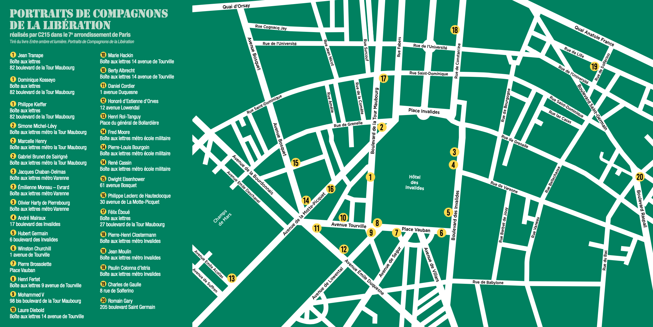 Pour toucher tous les publics, C215 a peint sur du mobilier urbain ces mêmes portraits de Compagnons dans le quartier des Invalides. Un lien choisi par l’artiste comme une passerelle entre l’extérieur et l’intérieur. Chaque visiteur est ainsi invité à poursuivre la découverte de ces oeuvres dans le 7e arrondissement et à s’interroger sur les valeurs citoyennes qu’incarnent ces représentants de « l’Armée des ombres ».