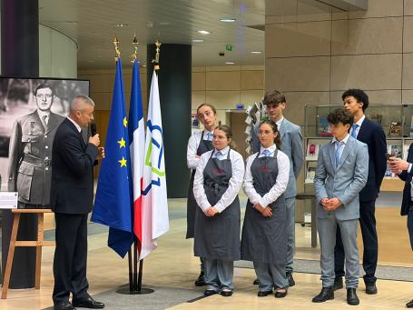 Le général d'armée (2S) Thierry Burkhard accompagné des jeunes du lycée hôtelier de Lille à l'occasion du démontage de l'exposition "Les Compagnons de la Libération par le Studio Harcourt"