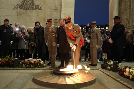 À cette occasion, le général d’armée (2S) Thierry Burkhard a présidé la cérémonie du ravivage de la flamme sous l’Arc de Triomphe, accompagné du Gouverneur militaire de Paris, le général de corps d’armée Loïc Mizon, et d'Alexandre Escorcia, directeur de cabinet de madame la ministre déléguée aux anciens combattants, Alice Rufo.