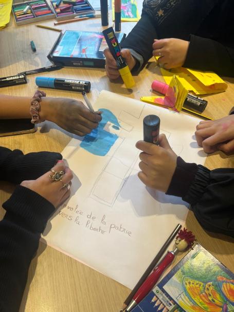 Atelier de création d'affiches en l’honneur du médaillé de la Résistance Daniel Mayer, par les élèves de la classe de défense