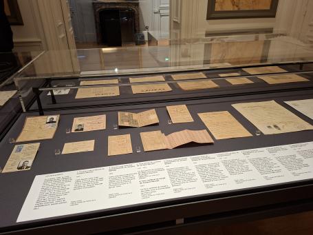 Vitrine présentant les faux documents de Jacques Baumel établis pendant la guerre.