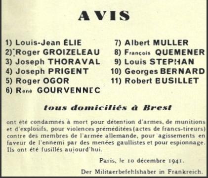 Louis Elie, un entrepreneur dans le transport de Brest, n’accepte pas l’armistice et l’occupation Allemande. Il fonde dès septembre 1940 un des tous premiers groupes de résistants à Brest. Comptant environ 70 membres, son groupe est engagé dans le renseignement et la lutte armée mais à partir de mai 1941, il est décimé par des vagues d’arrestations. Les principaux responsables et chefs de groupes tombent tour à tour et sont incarcérés à la prison de Bouguen. Transférés ensuite à Rennes puis à Fresnes, ils sont jugés à l’hôtel Continental de Paris par un tribunal militaire allemand. Onze sont condamnés à mort et fusillés le 10 décembre 1941 au Mont-Valérien. Georges Bernard, Robert Busillet, Louis Elie, René Gourvennec, Roger Groizeleau, Albert Muller, Roger Ogor, Joseph Prigent, François Quéméner, Louis Stéphan et Joseph Thoraval recevront la médaille de la Résistance française à titre posthume.