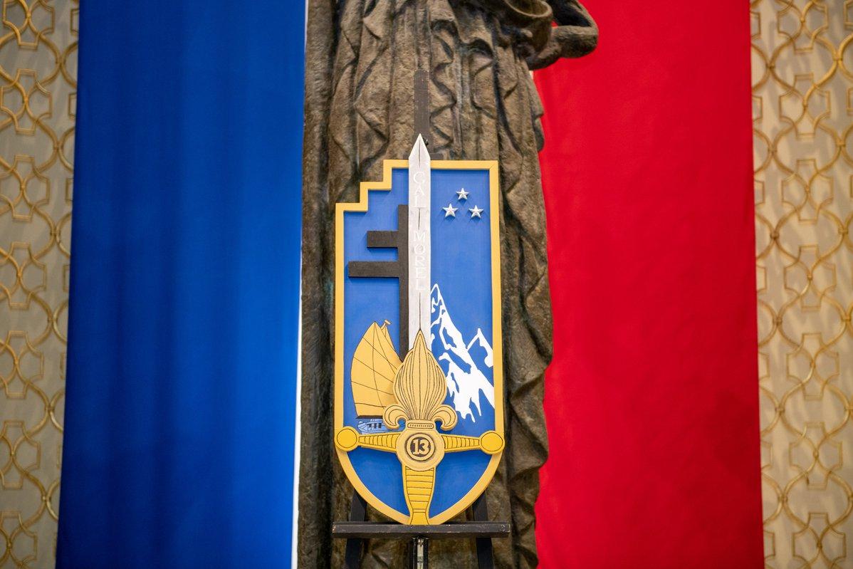 • L’écu découpé en chef senestre, la grenade et le chiffre « 13 » rappellent la Légion Étrangère et plus particulièrement la 13ème DBLE, qui occupèrent une grande place dans la carrière du parrain.