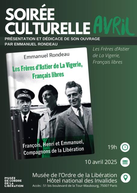 Le 10 avril à 19h, la soirée culturelle sera consacrée à la présentation du livre Les frères d’Astier de La Vigerie, Français libres, publié aux éditions Tallandier. L'auteur, Emmanuel Rondeau, partagera avec le public ses recherches et ses réflexions sur cette phratrie hors du commun.