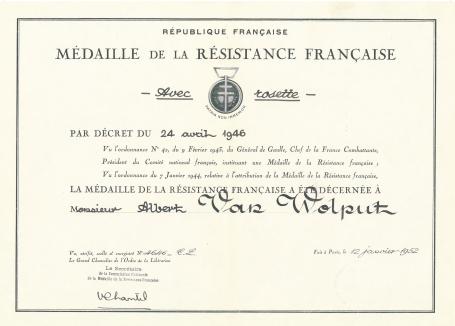 Diplôme de la médaille de la Résistance française avec rosette d’Albert Van Wolput