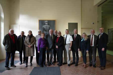 Madame Catherine Vautrin, ministre des Armées et des Anciens combattants, le général d'armée (2S), Thierry Burkhard, délégué national de l'Ordre de la Libération, Jean-Marc Roze, président du conseil départemental, madame Anne de Laroullière (petite-fille du général de Gaulle) et des membres du conseil départemental jeune, à l'inauguration de l'exposition.