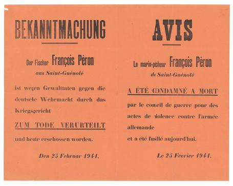 Le 20 novembre 1940 à 23 heures, François Péron se trouve au café de l'Océan à Saint-Guénolé avec d'autres pêcheurs afin de « faire la part » de la pêche du jour. Voyant de la lumière allumée, une patrouille de la Feldgendarmerie entre pour effectuer un contrôle d’identité. Ne supportant pas qu’un soldat allemand pointe son arme contre lui, Péron tente de la détourner. Un coup part alors et un projectile se fiche dans le plafond. Après avoir été assommé par un coup de crosse, Péron est emmené par les Allemands.